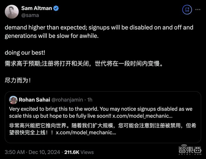 OpenAI联合创始人兼CEO Sam Altman转发了Sora团队技术人员关于注册被禁用的帖子:“需求高于预期,注册将被禁用,生成将在一段时间内变慢。尽力而为。”