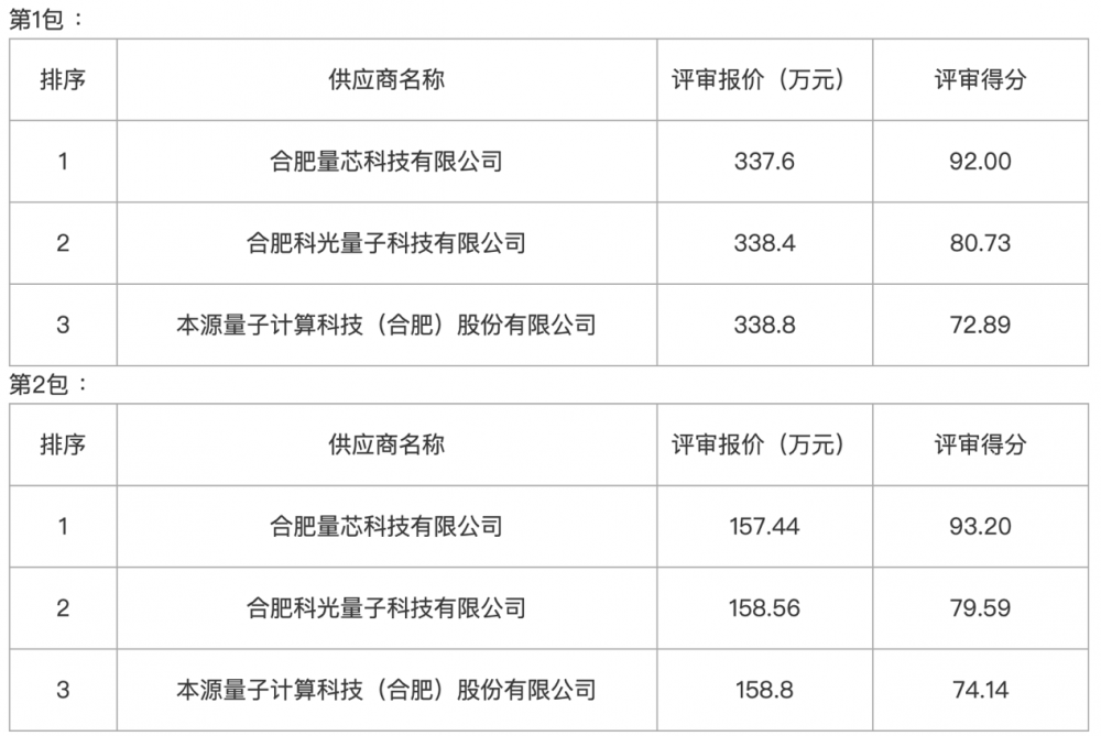 其他通过资格审查和符合性审查的供应商还有合肥科光量子科技有限公司、本源量子计算科技(合肥)股份有限公司。具体评审报价如下: