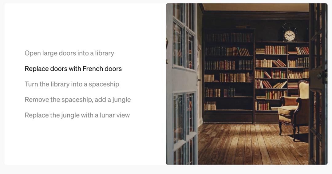这个功能不太好翻译,可能是AI才有的新活儿,就是你可以改变视频中的某个要素。比如说先让Sora生成“推开图书馆大门”,然后可以把大门换成法国风格,可以把图书馆换成宇宙飞船,可以把推开门的场景换成热带雨林,也可以再把热带雨林换成月夜美景——与此同时,大门的风格和视频的其他部分保持不变。