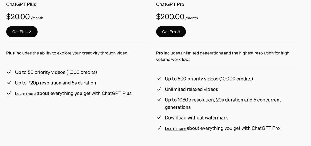 20美元一个月的ChatGPT Plus用户,每月可以生成最多50个视频,时长最多5秒,分辨率最高720p。每月200美元的ChatGPT Pro用户,每月最多可以生成500个视频,可以同时生成五个视频,时长20秒,分辨率提高到了1080p,还提供无水印下载功能,慢速视频生成功能则可以无限使用。