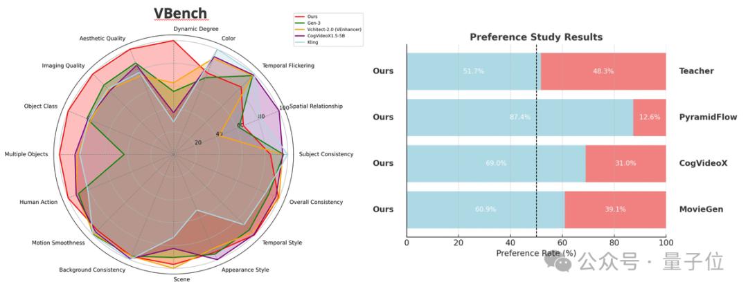 生成质量经VBench和用户调查验证,优于主流模型例如Meta的MovieGen和智谱的CogVideoX