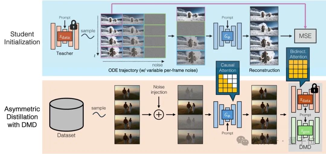 引入一个拥有未来信息的双向教师模型,在蒸馏训练阶段指导自回归的单向学生模型。这种教师-学生结构允许模型在生成未来帧时具备更强的精确度。