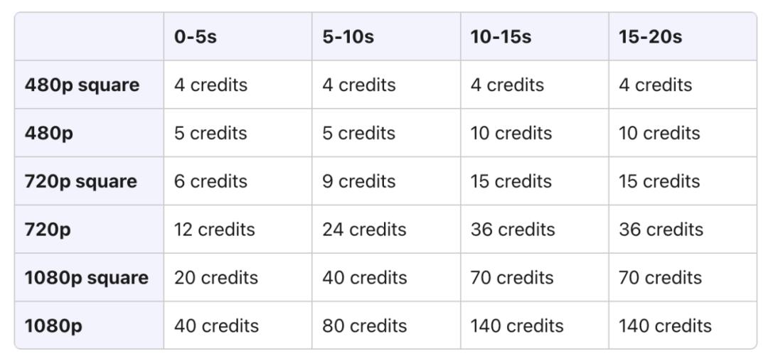 比如生成一个480P、5s的视频需要25个积分,如果生成480P、20s的视频则需要150个积分。此外,如果使用Remix(重混)、Re-cut(重新剪辑)、Storyboard(故事板)、Loop(循环)、Blend(混合)这些功能,则需要额外的积分。