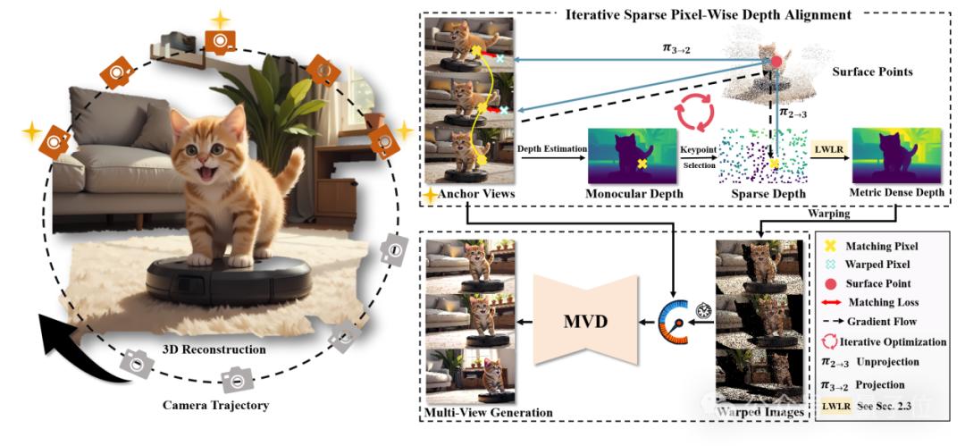 c) 几何一致性:模型可支持长序列新视角的生成,保持前后帧视图的几何一致性,并遵循真实三维几何的物理规则。即使视角轨迹发生变化,返回时场景依然保持高逼真和一致性。