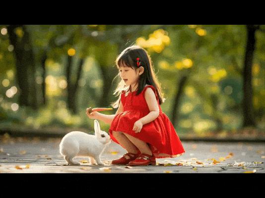 第一条:镜头中景拍摄,夕阳下,两个长头发的女生,一个穿着黄裙子,一个穿着蓝裙子,手里都拿着胡萝卜,旁边还有三只小兔子,小兔子慢慢跑过去吃胡萝卜,电影级调色。