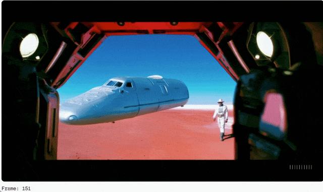 接着,将114-324帧的场景变为,“从宇宙飞船内部向外看,一位宇航员站在中间”。