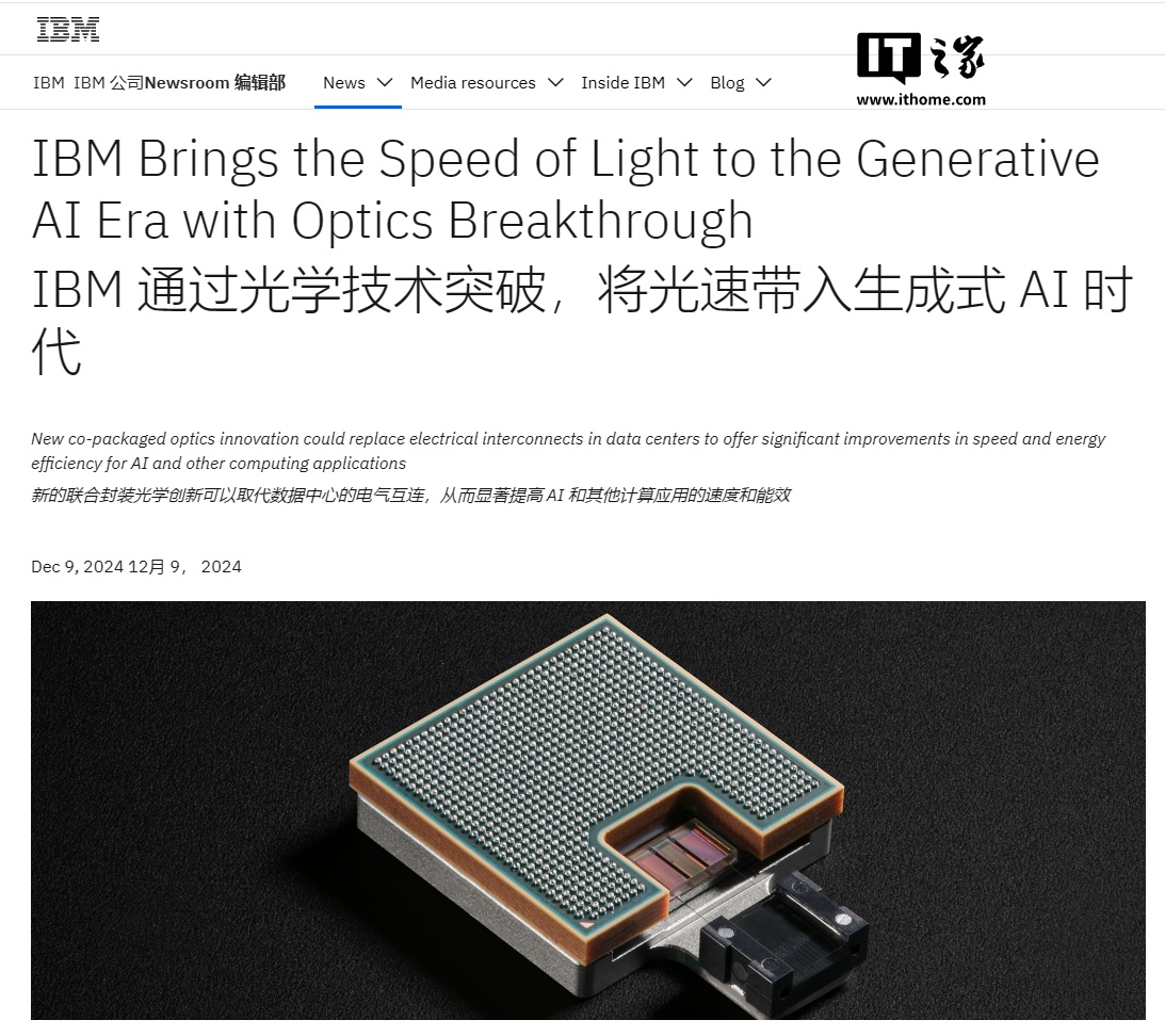 IT之家 12 月 11 日消息,IBM 宣布开发出一种新的光学技术,能够以光速训练 AI 模型,同时大幅节省能源。该公司表示,通过将这项突破应用于数据中心,训练一个 AI 模型所节省的能源相当于 5000 个美国家庭一年的能源消耗。