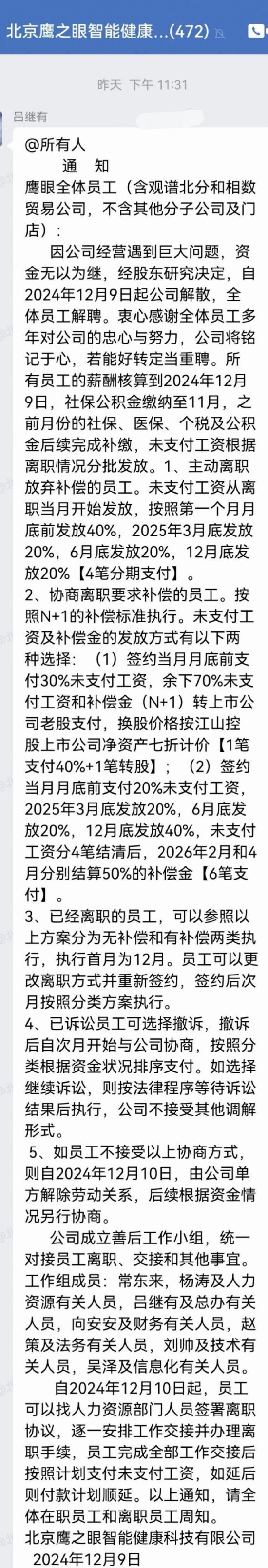 多位鹰眼智慧中医员工向新浪科技表示,在 12 月 9 日半夜 23:31 分,公司战略管理部总经理兼总裁办公室主任吕继有突然在企业微信全员群里发布了解散通知。通知称,因公司经营遇到巨大问题,资金无以为继,经股东研究决定,自 2024 年 12 月 9 日起公司解散,全体员工解聘。所有员工的薪酬核算到 2024 年 12 月 9 日,社保公积金缴纳至 11 月,之前月份的社保、医保、个税及公积金后续完成补缴,未支付工资根据离职情况分批发放。