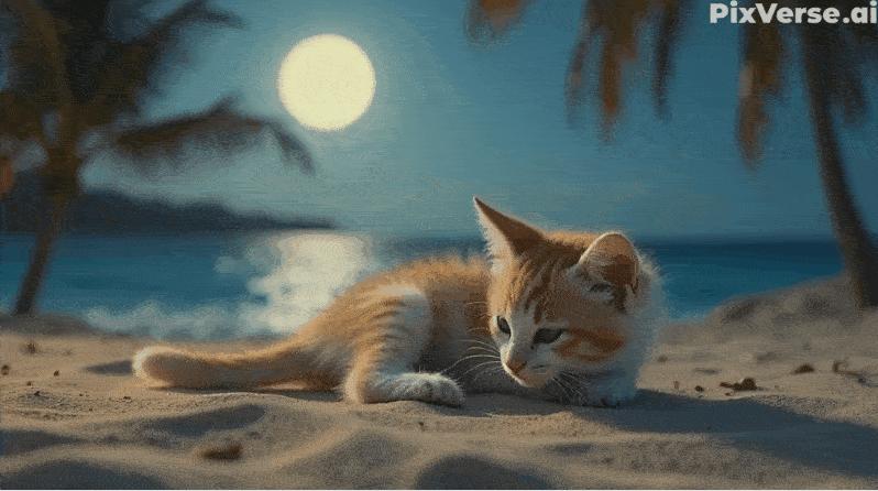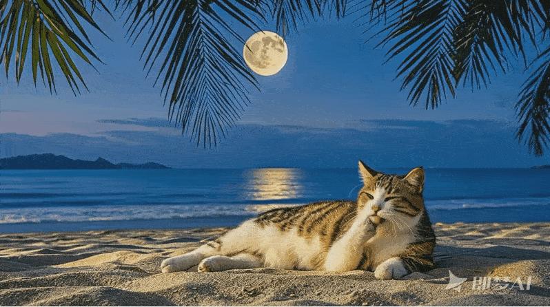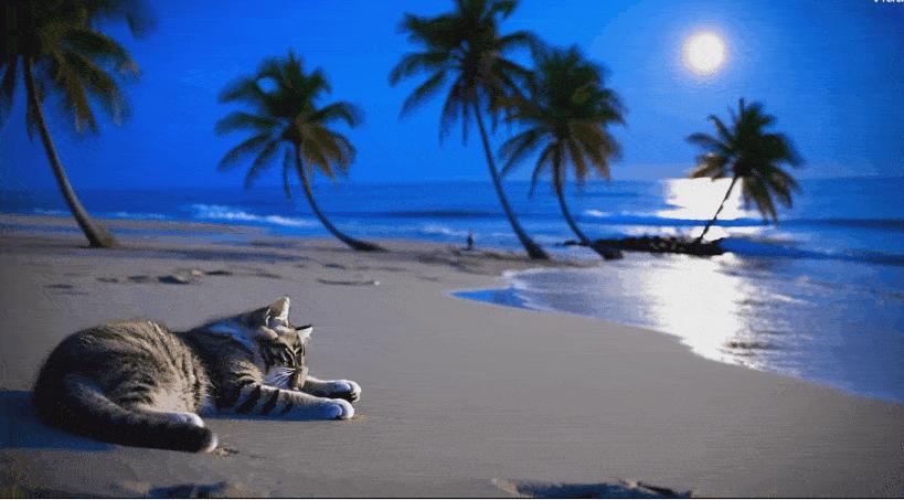 小雷以“宁静的海滩,满月高悬在天空,微风吹动着海边的椰子树,发出哗啦啦的声音,一只小猫咪慵懒地躺在沙滩上,舔舐着前腿上的毛发”为描述语生成了一段视频。具体结果如下,无论是舔舐毛发还是风吹动椰子树,细节丰富程度都非常高,唯一较为明显的漏洞可能在于生成的结果是在白天,而非小雷描述的夜晚。