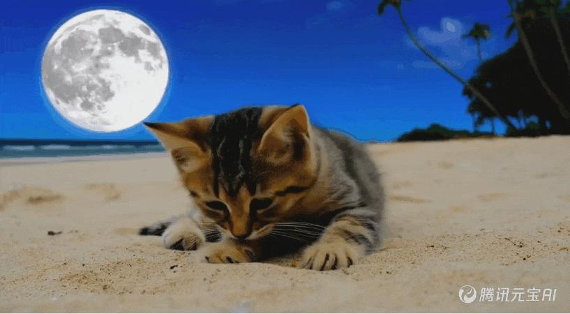 腾讯混元视频大模型现阶段仅支持文生视频,每日可免费生成4次标准品质和2次高品质视频。小雷也使用腾讯混元大模型生成了一段视频,太大的月亮造成了虚假感,猫咪舔舐毛发的动作更是满满的违和感,椰子树距离过远,细节不够丰富。