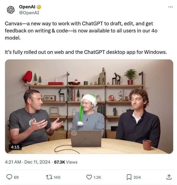 OpenAI 今日在直播活动中宣布,其写作和编程工具 Canvas 将向所有 ChatGPT 用户开放,同时新增多项功能。