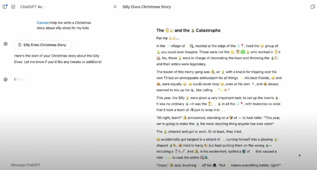 OpenAI 演示了如何在 Canvas 中创作故事,比如:“帮我为我的孩子们写一个关于搞笑精灵的圣诞故事。”