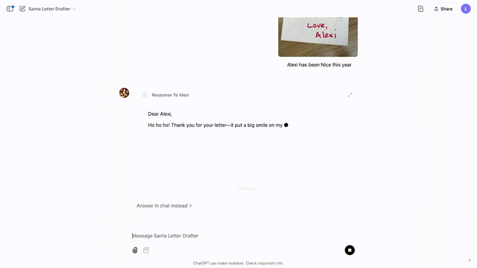 上传一封Alexi给圣诞老人信件的照片到定制的「Santa Letter Drafter」中。