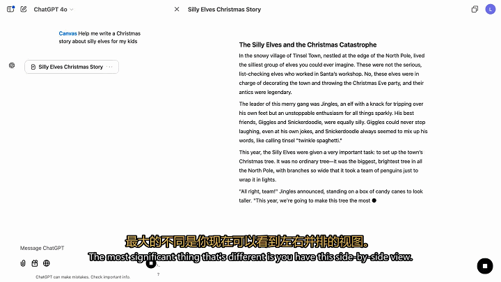 给ChatGPT输入指令之后,便会跳转到一个左右并排的视图,左边是我们熟悉的聊天界面,右边就是Canvas了。