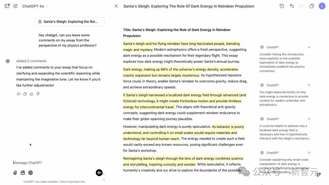 在GPT提供修改建议的时候,它会直接在Canvas界面中进行批注,比以往仅在聊天框中提供建议要直观了许多。