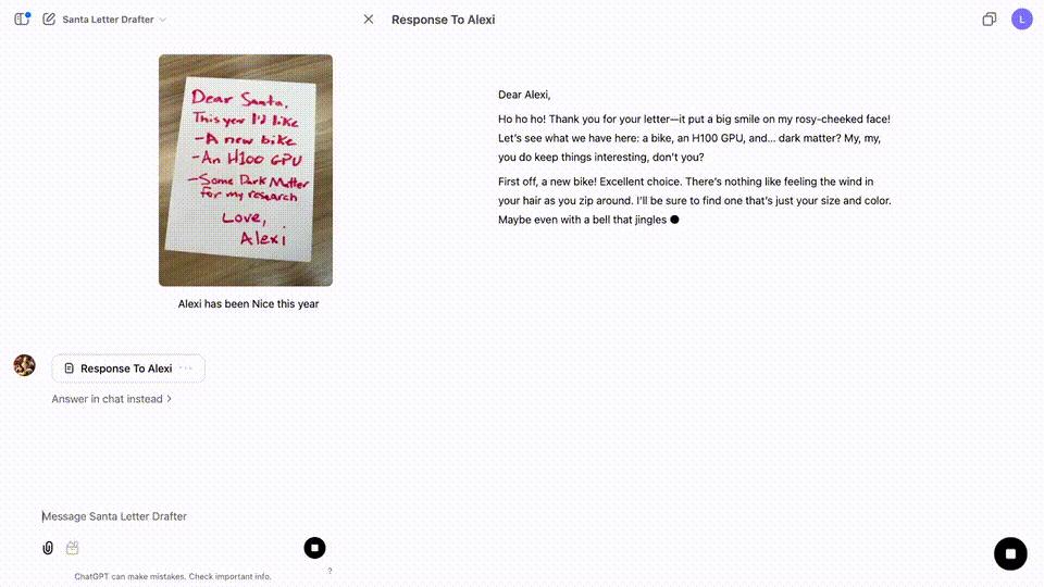 除了上传照片外,研究人员又向圣诞老人GPT提供了关于Alexi个人性格方面的背景——他今年表现很好。