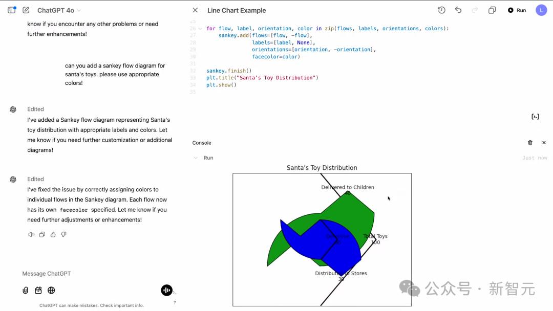接下来,他们让ChatGPT生成了一个关于圣诞老人玩具的Sankey流程图,并且添加颜色,呈现圣诞主题的效果。