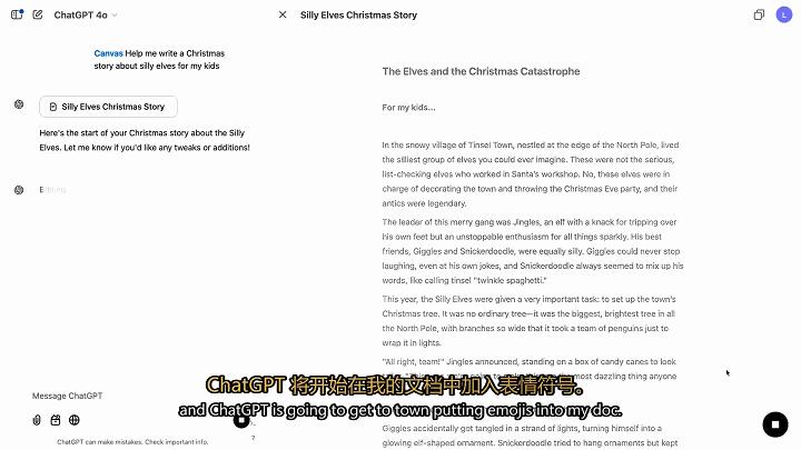 在指令中,通过添加「可以使用Canvas」的提示,便可以实现这个能力。而且,指令中可以规定圣诞老人回复邮件的风格,要幽默风趣。