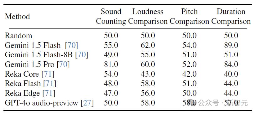 然而,测试结果却令人震惊——这些顶尖的AI模型在大多数任务中的表现,几乎与随机猜测无异,准确率和随机选择的50%差不多,无疑暴露了多模态大模型在音频感知上的巨大短板。