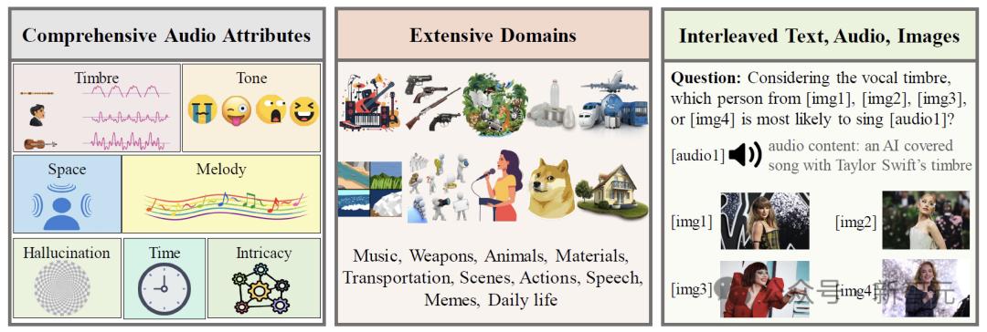 AV-Odyssey包含26个任务,覆盖了7种声音属性——音色、语调、旋律、空间感知、时序、幻觉、综合感知,并且跨越了10个不同领域,确保测试的深度和广度。