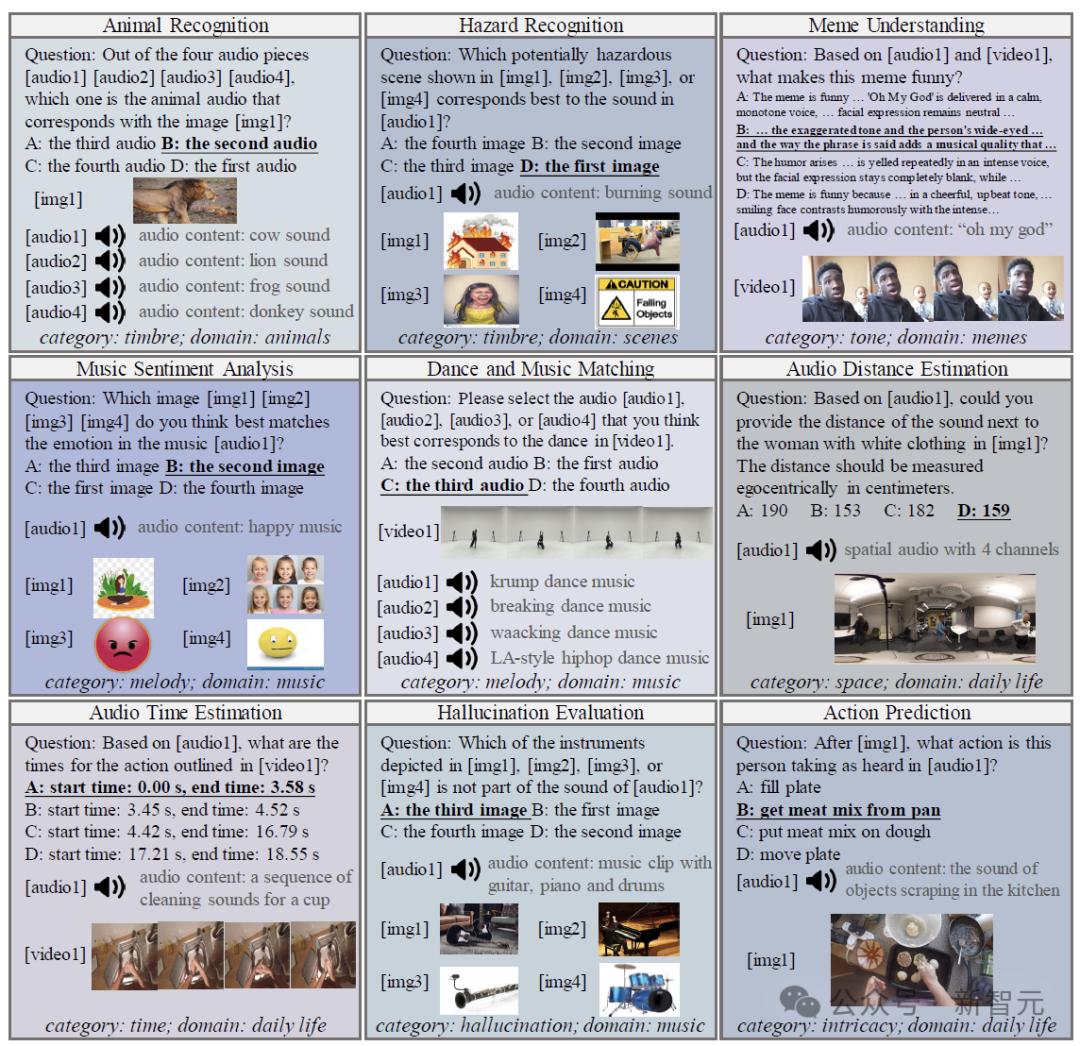 为了确保评估的稳健性和公正性,所有任务均采用四选一的多项选择题形式,每个问题都融合了视觉、听觉等多模态信息,全面考察模型的综合处理能力。