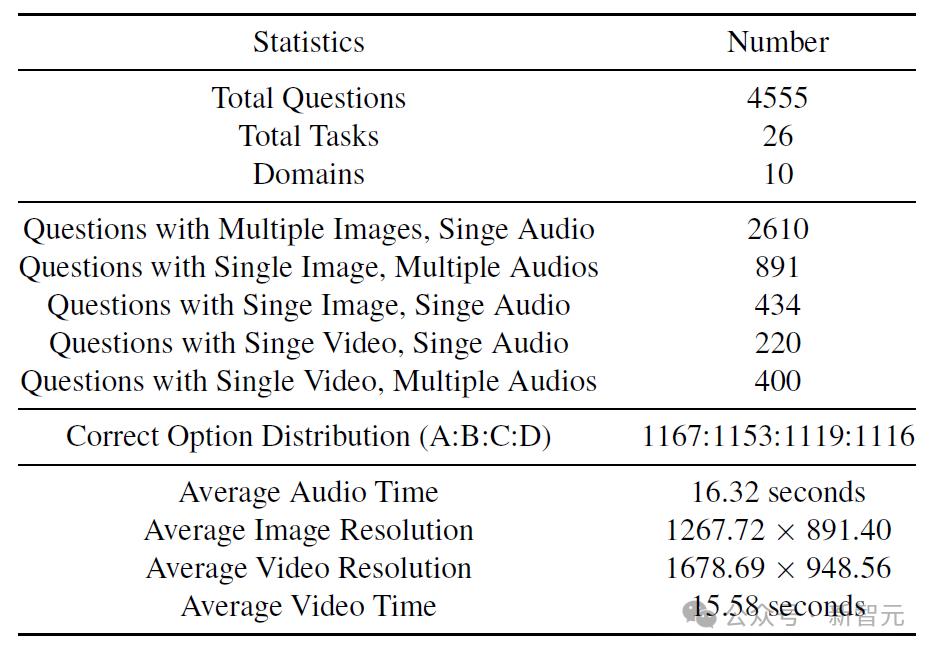 同时,为了进一步控制质量,研究团队利用5个视觉语言模型和4个音频大语言模型,过滤出包含冗余图像或音频片段的问题。