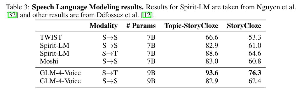 在语音语言建模任务中,GLM-4-Voice 在 Topic-StoryCloze 和 StoryCloze 等数据集上的准确率显著领先同类模型。在从语音到文本生成(S→T)的任务中,GLM-4-Voice 的准确率达到 93.6%(Topic-StoryCloze),远高于其他模型。同时,在语音到语音生成(S→S)的任务中,GLM-4-Voice 依然在 Topic-StoryCloze 数据集中获得了与 Spirit-LM 相近的高分(82.9%)。