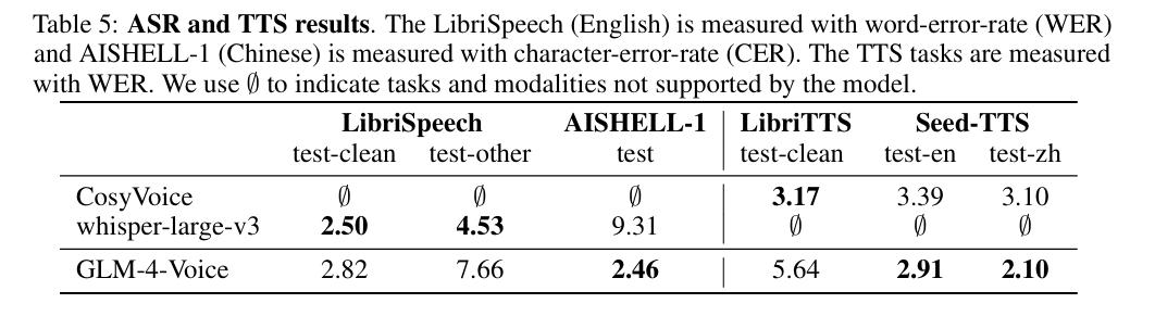 在 ASR 和 TTS 任务中,GLM-4-Voice 的性能也同样接近或超越专门设计的语音处理模型。