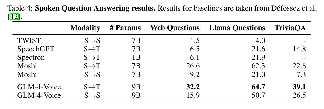 在语音问答任务中,GLM-4-Voice 在 Web Questions、Llama Questions 和 TriviaQA 等数据集上全面领先,进一步提升了模型在长上下文交互场景中的适应性。