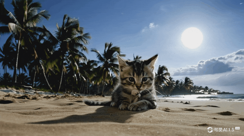 小雷以“宁静的海滩,满月高悬在天空,微风吹动着海边的椰子树,发出哗啦啦的声音,一只小猫咪慵懒地躺在沙滩上,舔舐着前腿上的毛发”为描述语生成了一段视频。具体结果如下,无论是舔舐毛发还是风吹动椰子树,细节丰富程度都非常高,唯一较为明显的漏洞可能在于生成的结果是在白天,而非小雷描述的夜晚。