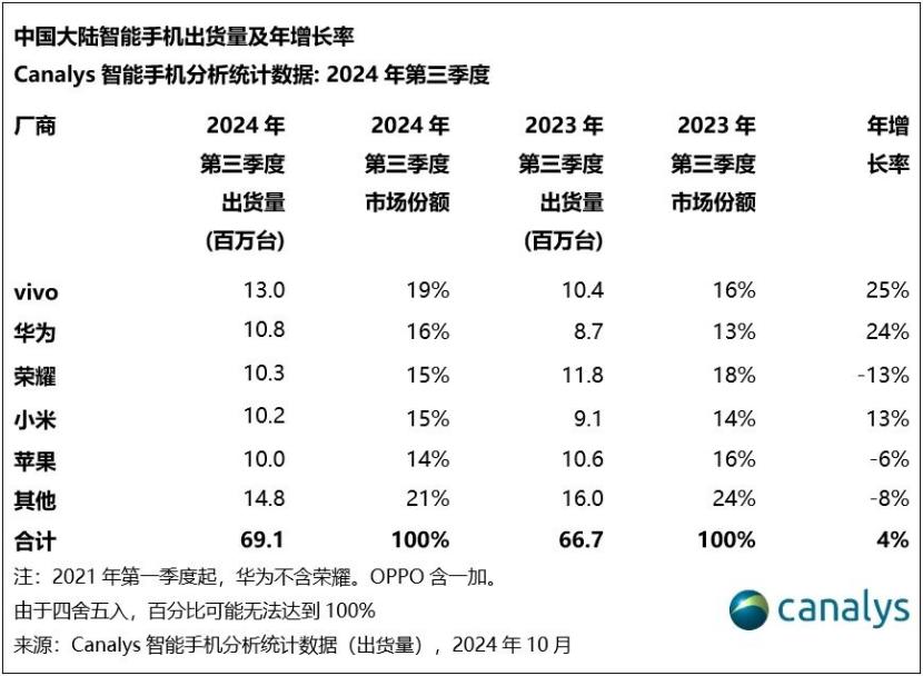 与营收一起下滑的,还有iPhone在中国市场的销量。Canalys数据显示,2024年第三季度,中国大陆智能手机市场延续了反弹的步伐,出货量同比增长4%至6910万台。苹果却逆势下跌,尽管重回前五,但出货量同比下跌6%。