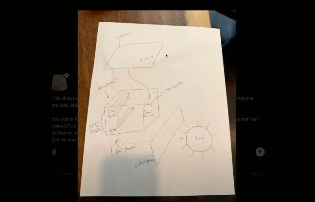 发布会上,o1模型的负责人画了一个草图。这个草图是关于一个系统,用来收集太阳能,供应给太空数据中心。