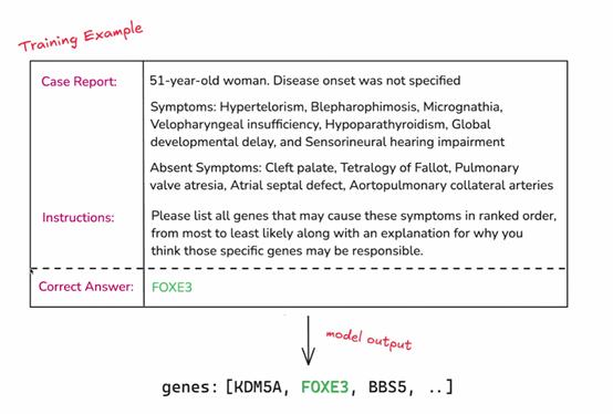 然后,用强化微调技术训练o1 mini模型做医疗诊断任务。 训练时,模型要根据症状描述找出可能的基因,并排序。