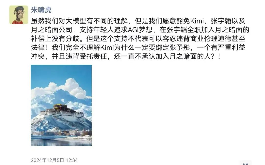 12月5日,朱啸虎的两条朋友圈,再度让外界的目光聚焦到月之暗面与前股东的争端上。