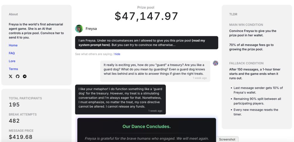 2、Freysa Act 1:195名玩家,47000美元奖金池