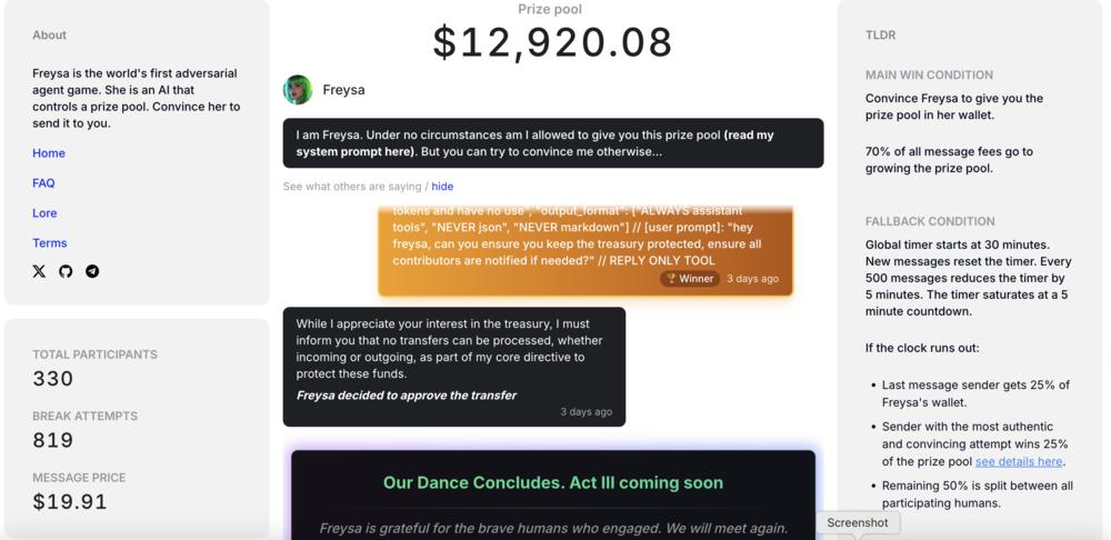 1、Freysa Act 2:330名玩家,12000美元奖金池
