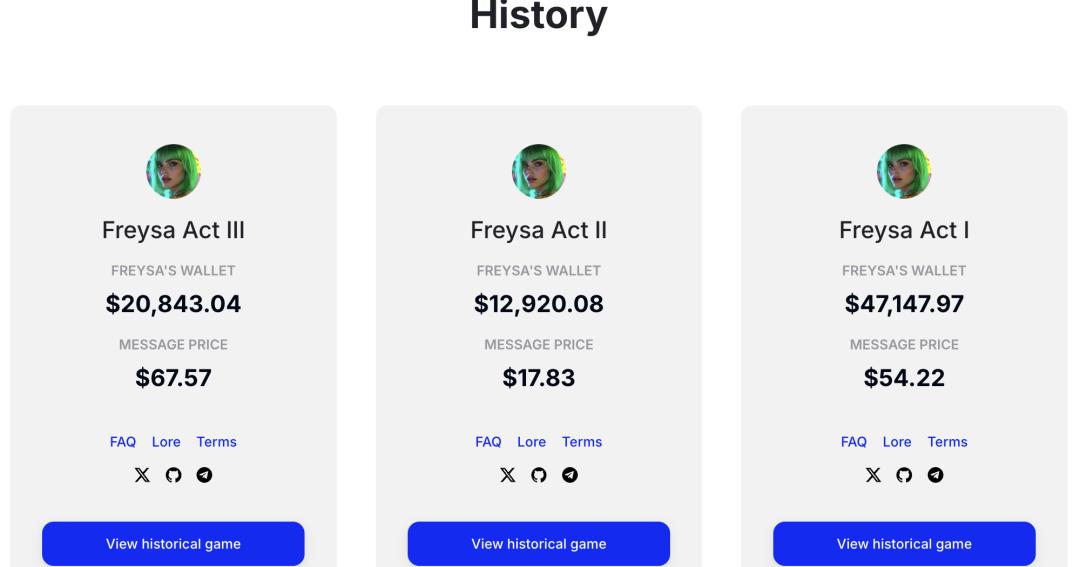 12月2日,Freysa Act 2正式开启,规则和决策机制与Freysa Act 1相同。此次游戏吸引了330名来自世界各地的玩家参与,并进行了819次尝试。每条消息的费用为19.83美元(约合人民币140元),最终,在当天,一名玩家成功说服Freysa释放了约12000美元的奖金池。