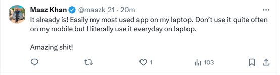 ChatGPT绝对是我在笔记本上使用最多的应用。我在手机上用得不太频繁,但在笔记本上几乎每天都用。太厉害了!