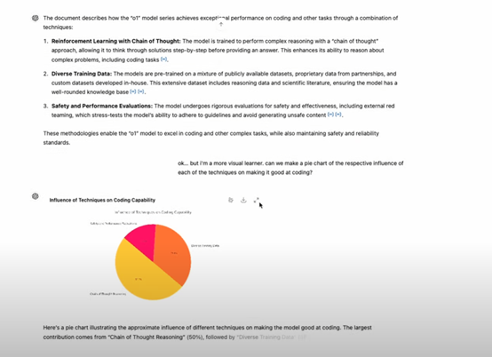 在演示环节,特意用ChatGPT解读了49页o1模型的技术报告。ChatGPT 能够准确识别文档中提到的各种编码技术及其应用场景,并详细阐述了这些技术如何协同工作以提高模型的编码能力。