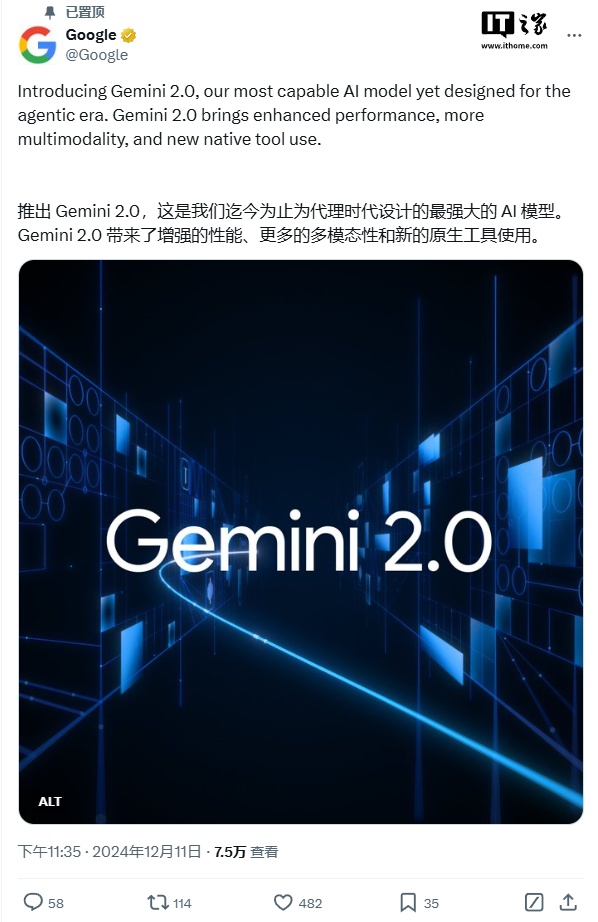 IT之家 12 月 11 日消息,谷歌正式发布 Gemini 2.0,号称是谷歌迄今为止功能最强的 AI 模型,带来了更强的性能、更多的多模态表现(如原生图像和音频输出)和新的原生工具应用。