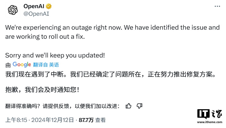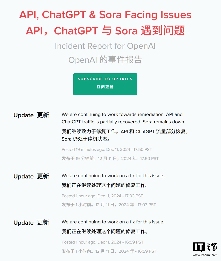 IT之家 12 月 12 日消息,北京时间今日上午,OpenAI 证实其聊天机器人 ChatGPT 正经历全球范围的宕机,ChatGPT、Sora 及 API 受到影响。该公司更新事故报告称,已查明宕机原因,正努力以最快速度恢复正常服务,并对宕机表示歉意。