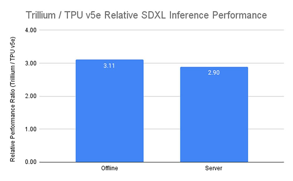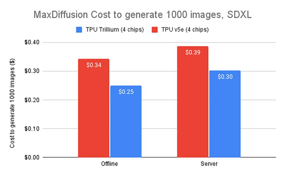 在Trillium上生成1000张图像的成本比离线推理的Cloud TPU v5e低27%,比在SDXL上进行服务器推理的Cloud TPU v5e低22%。
