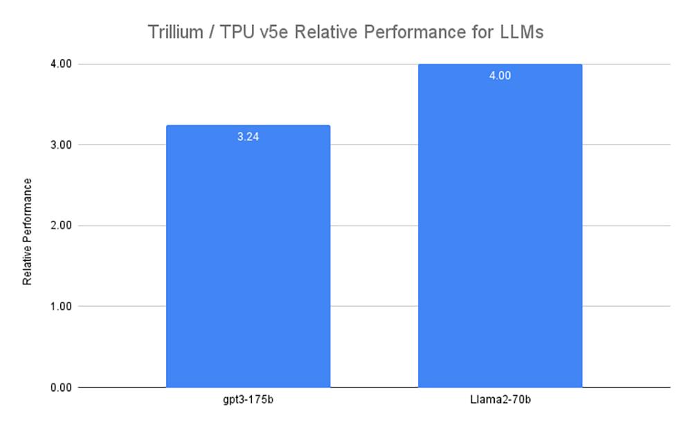 与上一代云TPU v5e相比,Trillium为密集大语言模型(如Llama-2-70b和gpt3-175b)提供高达4倍的训练速度,为MoE模型提供了比上一代云TPU v5e快3.8倍的训练。