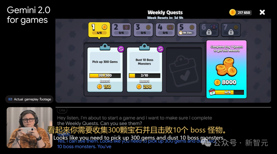 在demo中,研究者对Gemini 2.0说:「我打算玩游戏了,我想确保完成每周的任务。你能看到它们吗?」