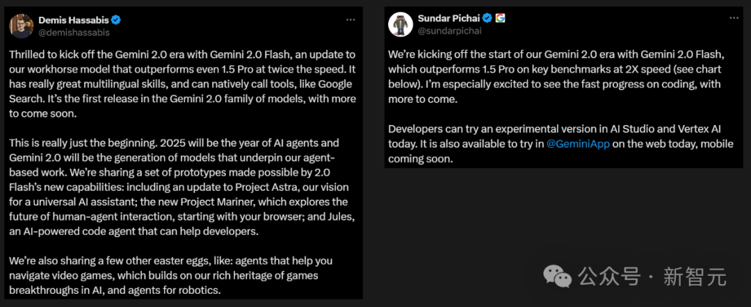 就在刚刚,谷歌CEO劈柴、DeepMind CEO哈萨比斯、DeepMind CTO Kavukcuoglu三位大佬联手官宣:新一代原生多模态模型Gemini 2.0 Flash正式发布!