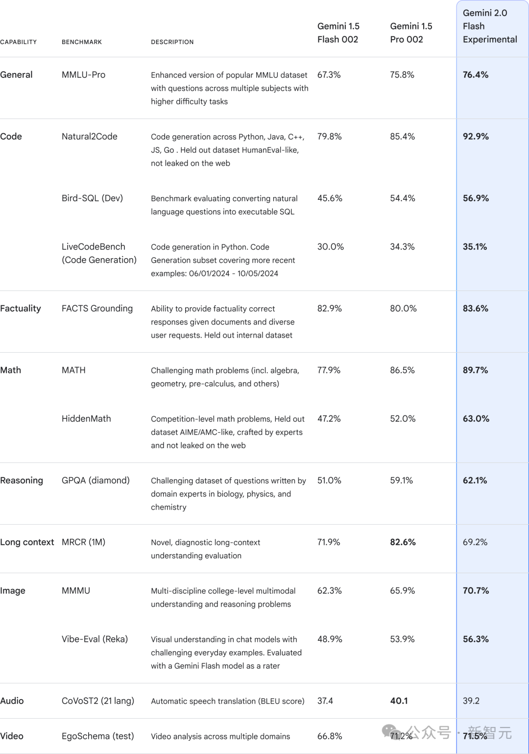 在各项基准测试中,相较于前一代1.5 Pro和1.5 Flash,最新2.0 Flash实现了全面的提升,尤其是代码、数学、推理能力方面。