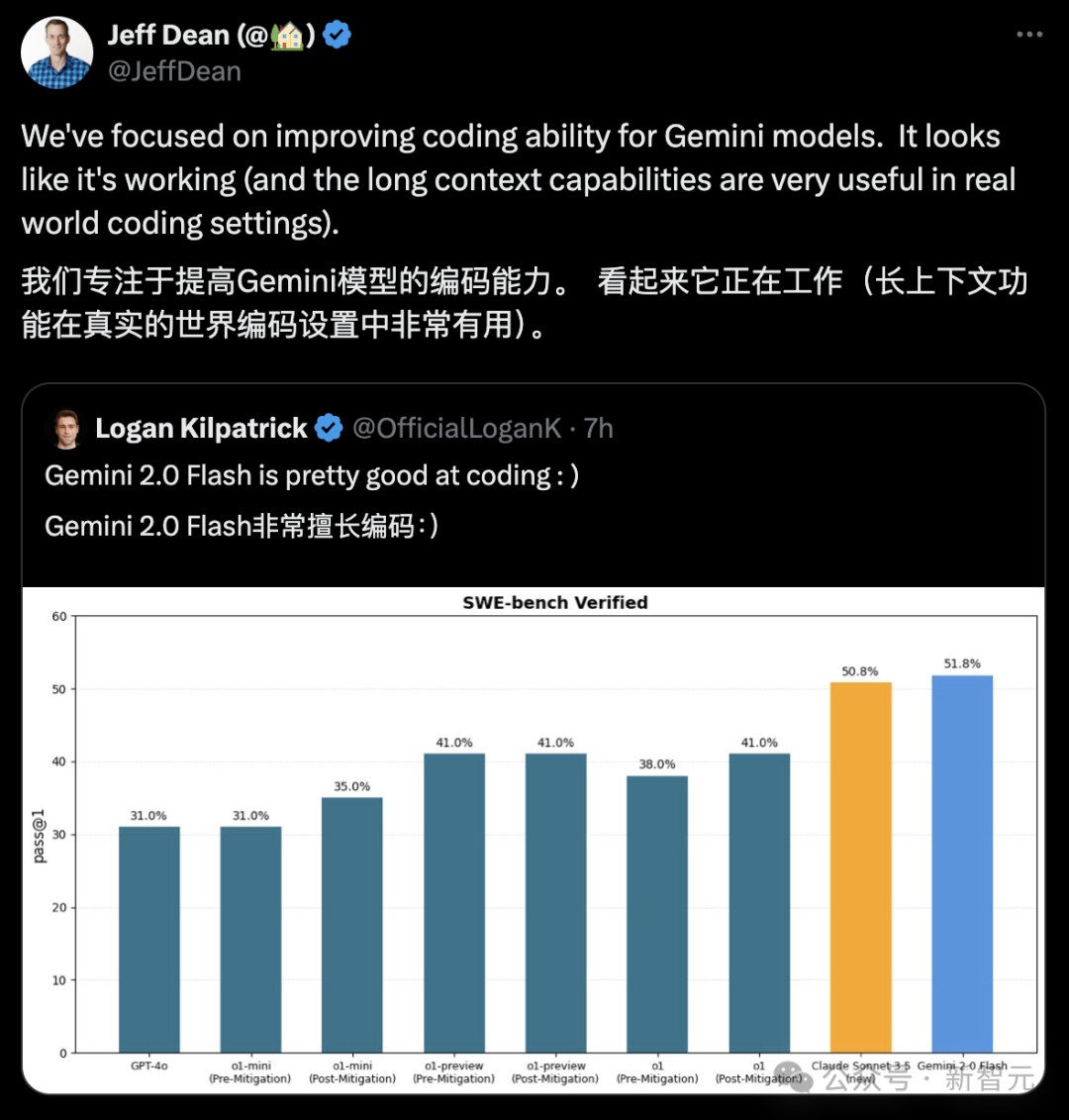 值得一提的是,Gemini 2.0 Flash非常擅长编码,在SWE-bench Verified基准上,直接击败完整版o1。