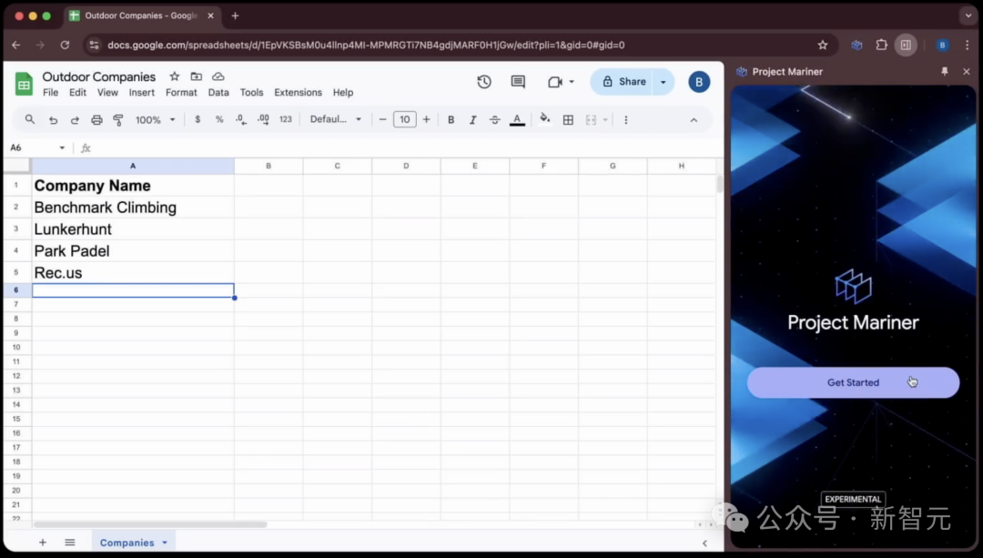 演示中,打开一个在线谷歌表格——户外公司,然后唤出Project Mariner(目前是Chrome实验性扩展程序)。