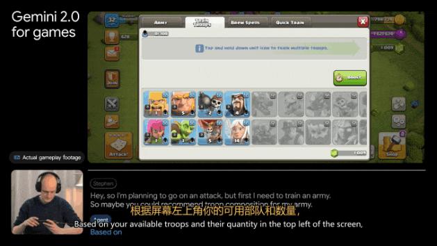 Gemini立刻给出了非常明智的建议: 「根据屏幕左上角你的可用部队和数量,我们应该训练巨人、野蛮人、弓箭手和法师的组合。重点是使用巨人来吸收伤害,法师可以对付高输出防御设施,野蛮人和弓箭手可以处理较弱的建筑。」