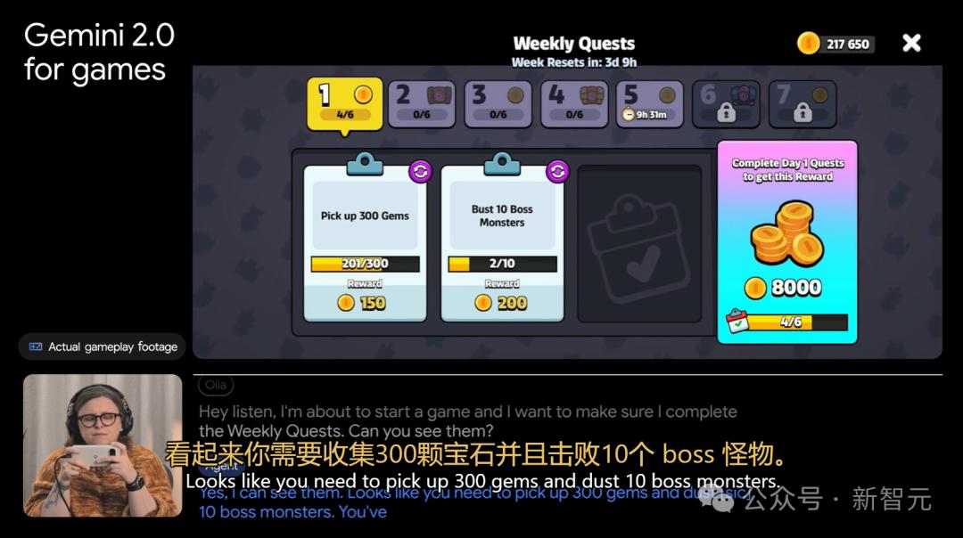 在demo中,研究者对Gemini 2.0说:「我打算玩游戏了,我想确保完成每周的任务。你能看到它们吗?」